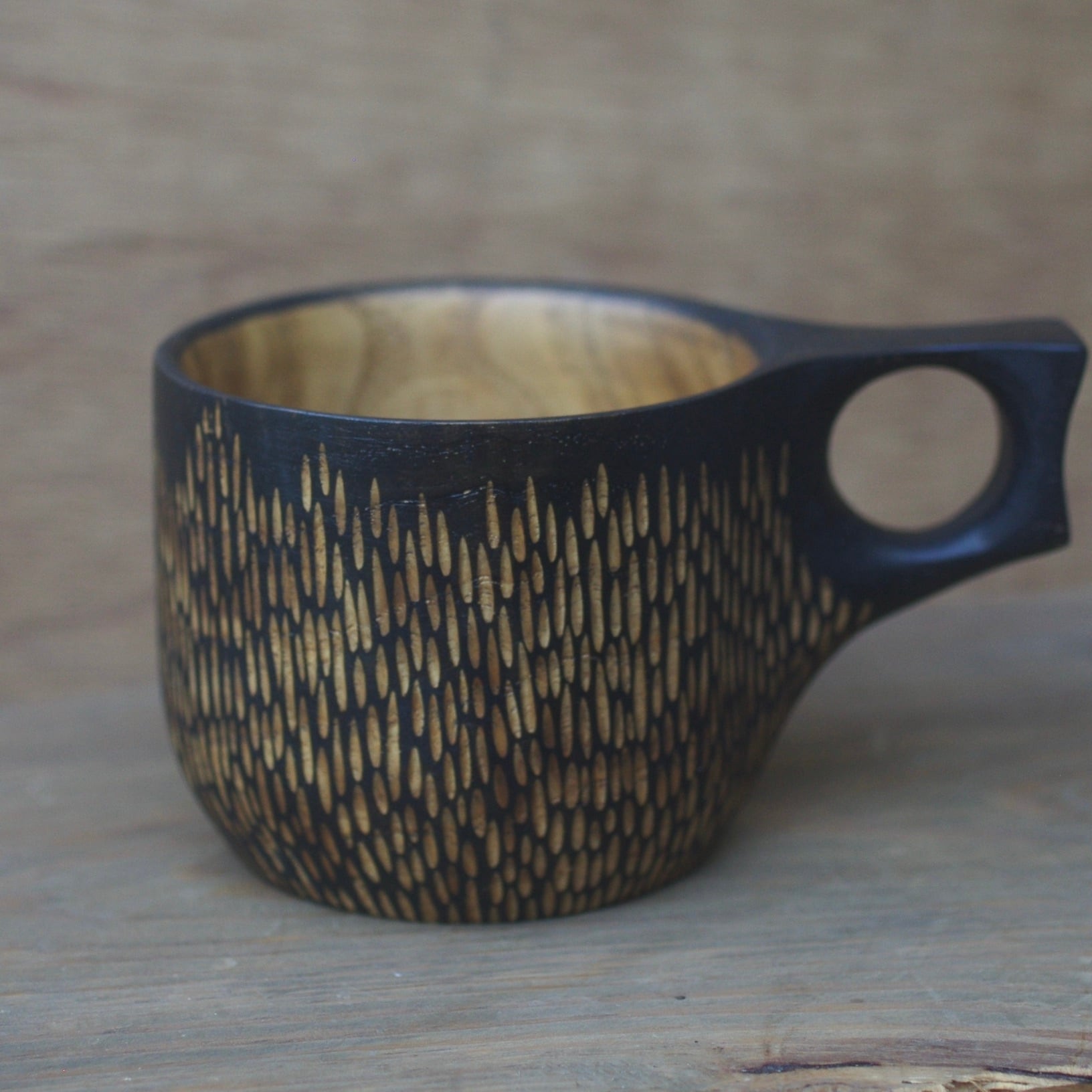 樹種:くり(岡山県) 塗装:ガラス塗料 《サイズ》 高さ 約7.3cm 口径 約8.7cm 重さ 145g 8分目容量 約180ml 満水容量 約230ml 《特徴》 ・木の伐採、製材、加工、彫り、塗装まですべて手作業の一点ものです。 ・鉄媒染で外側を黒く染めた後、彫りの模様を入れています。 ・全体に美しい杢(もく)が入っており、美味しく飲み干したあとも目で見て楽しませてくれます。 《ガラス塗料について》 ・ガラス塗料は、大地の主な構成要素であるシリカとも呼ばれるケイ素=ガラス=砂が主成分です。重金属などの乾燥剤が含まれる塗料とは異なり、食品安全基準試験をクリアし、F☆☆☆☆取得済みですので安心してお使いいただけます。 《鉄媒染について》 木に含まれるタンニンと鉄の反応で黒くなります。 木に鉄媒染液を塗って反応させます。 くりの木はタンニンを多く含んでおり、キレイに黒く染まります。 《杢について》 「杢 (もく)」とは、木材の木目の中でも、特に複雑で美しい模様のことです。木材の細胞の不規則な配列や、木が育つ過程で生じる歪みなどが原因で現れます。 《ご使用上の注意》 ・熱い飲み物を入れても大丈夫ですが、沸かしたてのあつあつの飲み物を入れるのは避けてください。 ・洗うときは柔らかいスポンジを使用してください。 ・電子レンジ、食洗機、乾燥機は使用を控えてください。 ・長時間の水やお湯へのつけ置きは避けてください。 ・直射日光が当たる場所に置くことは避けてください。 《商品について》 ・サイズはおよそです。 ・商品写真は部屋の照明やご使用のPCやスマートフォンのディスプレイの明るさや仕様により実物と異なって見える場合があります。ご了承の上お買い求めください。