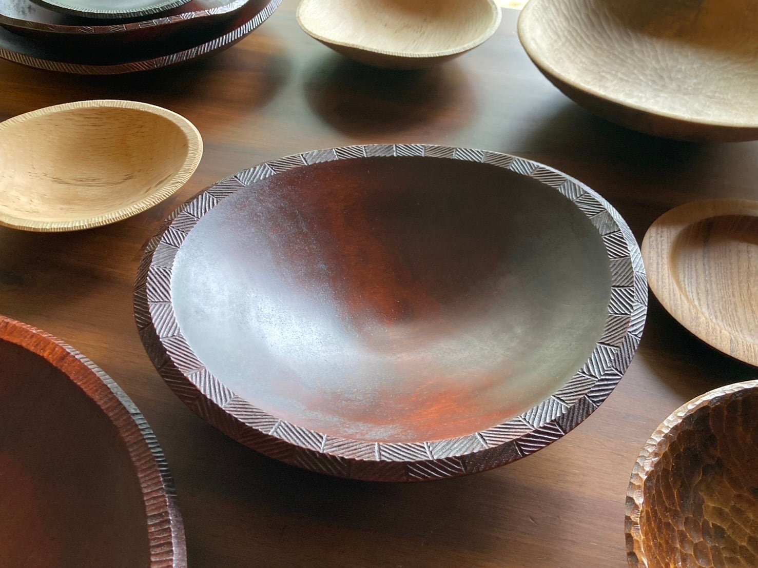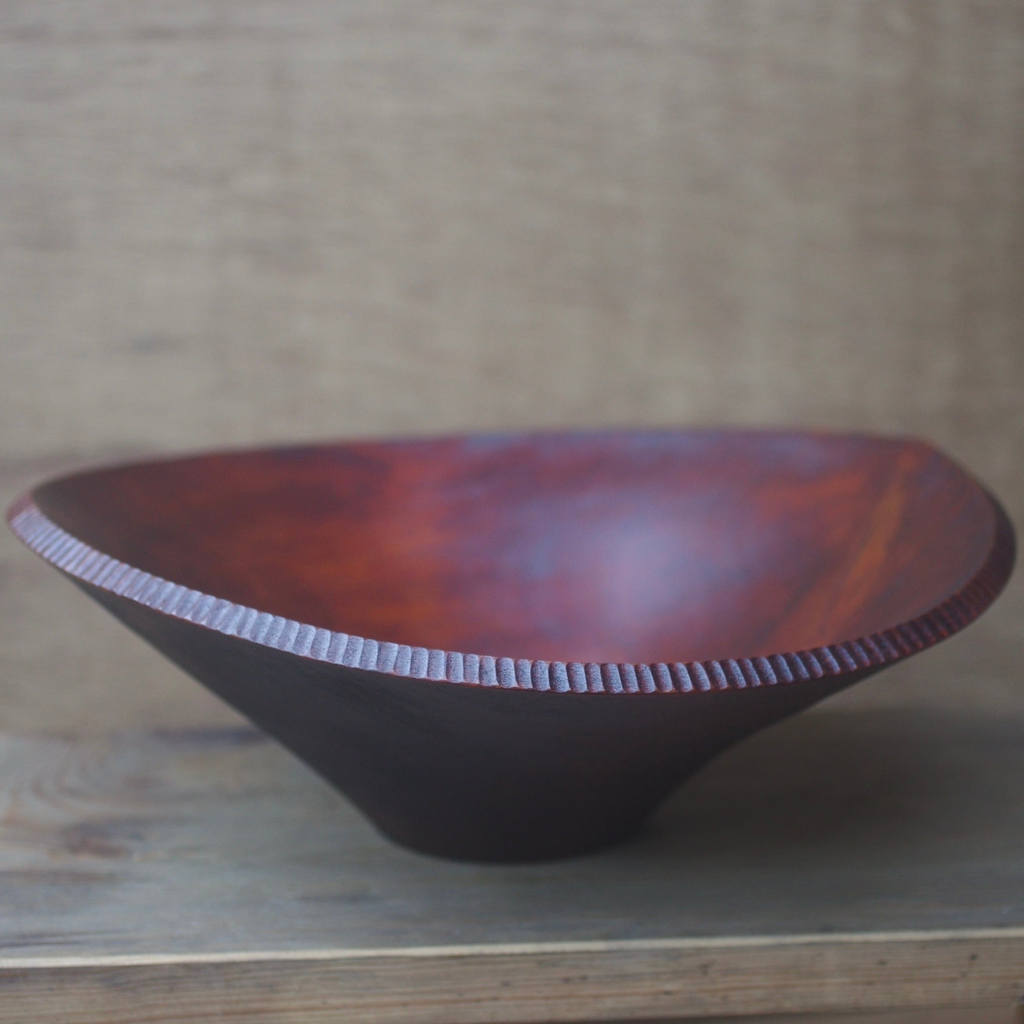 樹種:モチノキ(岡山県) 塗装:漆 《サイズ》 直径 約26.5〜27.3cm 高さ 約8.5〜10cm 重さ 約341g 《特徴》 ・木の製材、加工、彫り、塗装まですべて手作業の一点ものです。 ・縁に手彫りの模様を入れてあります。陰影が美しく、見た目のアクセントになります。 ・漆塗りの器なので汁っぽいおかずも油ものも気にせず使っていただけると思います。 《ご使用上の注意》 ・洗うときは柔らかいスポンジを使用してください。 ・電子レンジ、食洗機、乾燥機は使用を控えてください。 ・長時間の水やお湯へのつけ置きは避けてください。 ・直射日光が当たる場所に置くことは避けてください。 《商品について》 ・サイズはおよそです。 ・商品写真は部屋の照明やご使用のPCやスマートフォンのディスプレイの明るさや仕様により実物と異なって見える場合があります。ご了承の上お買い求めください。