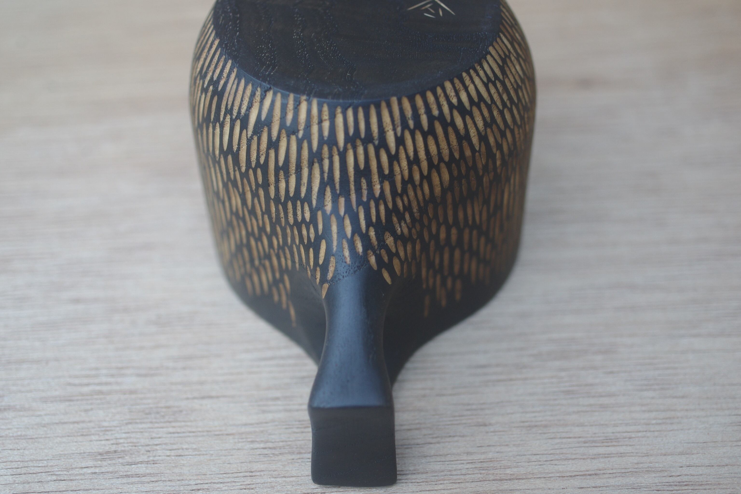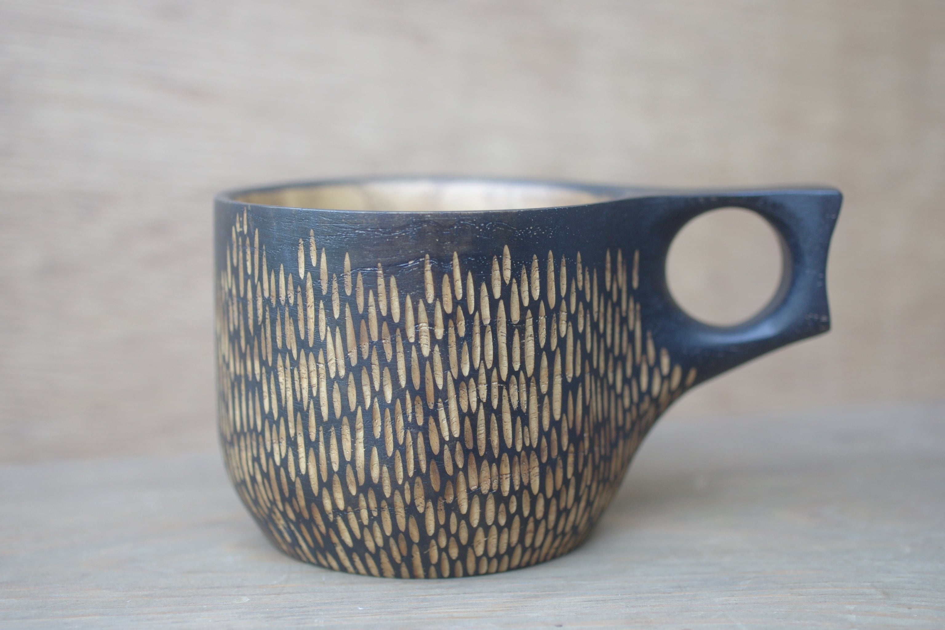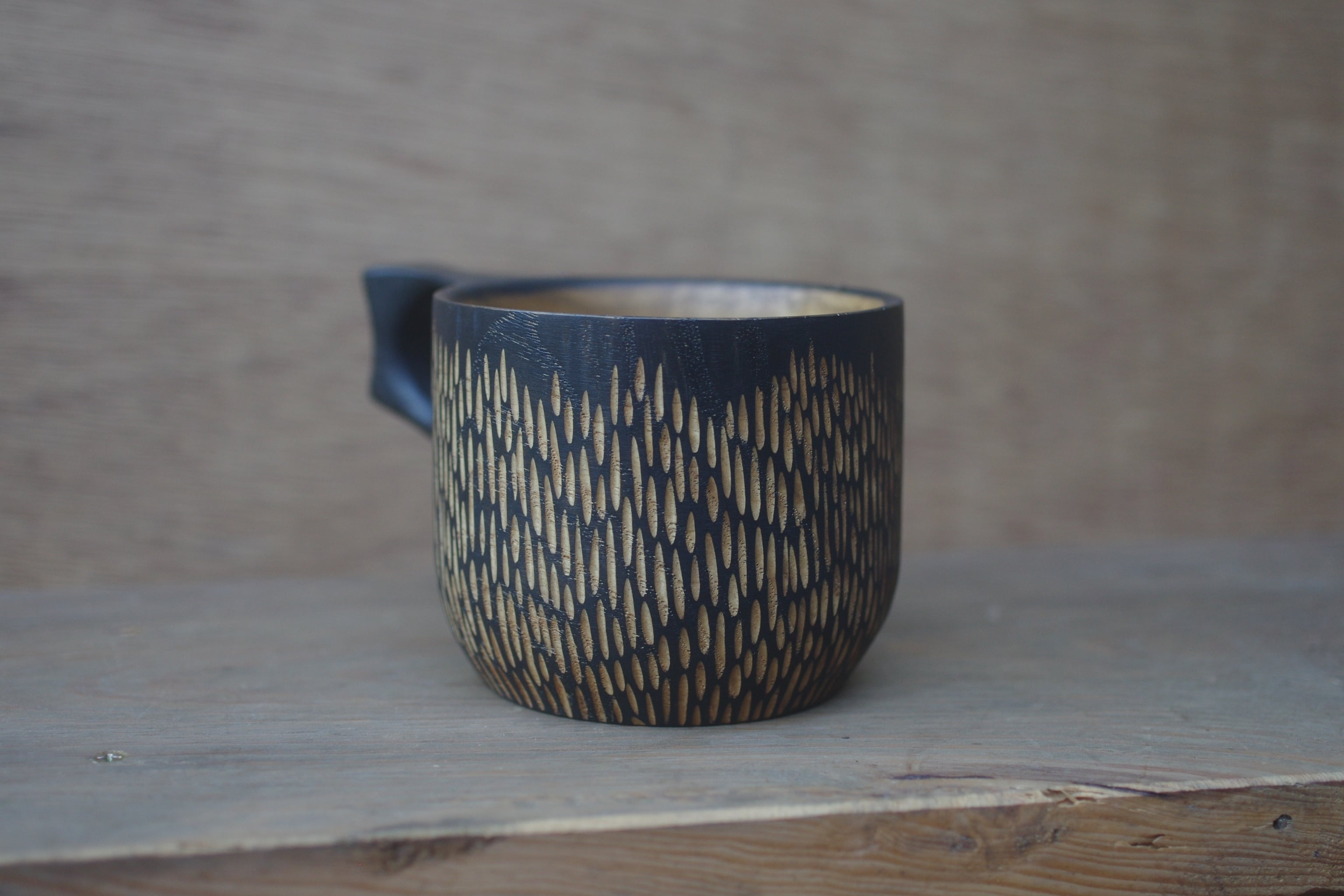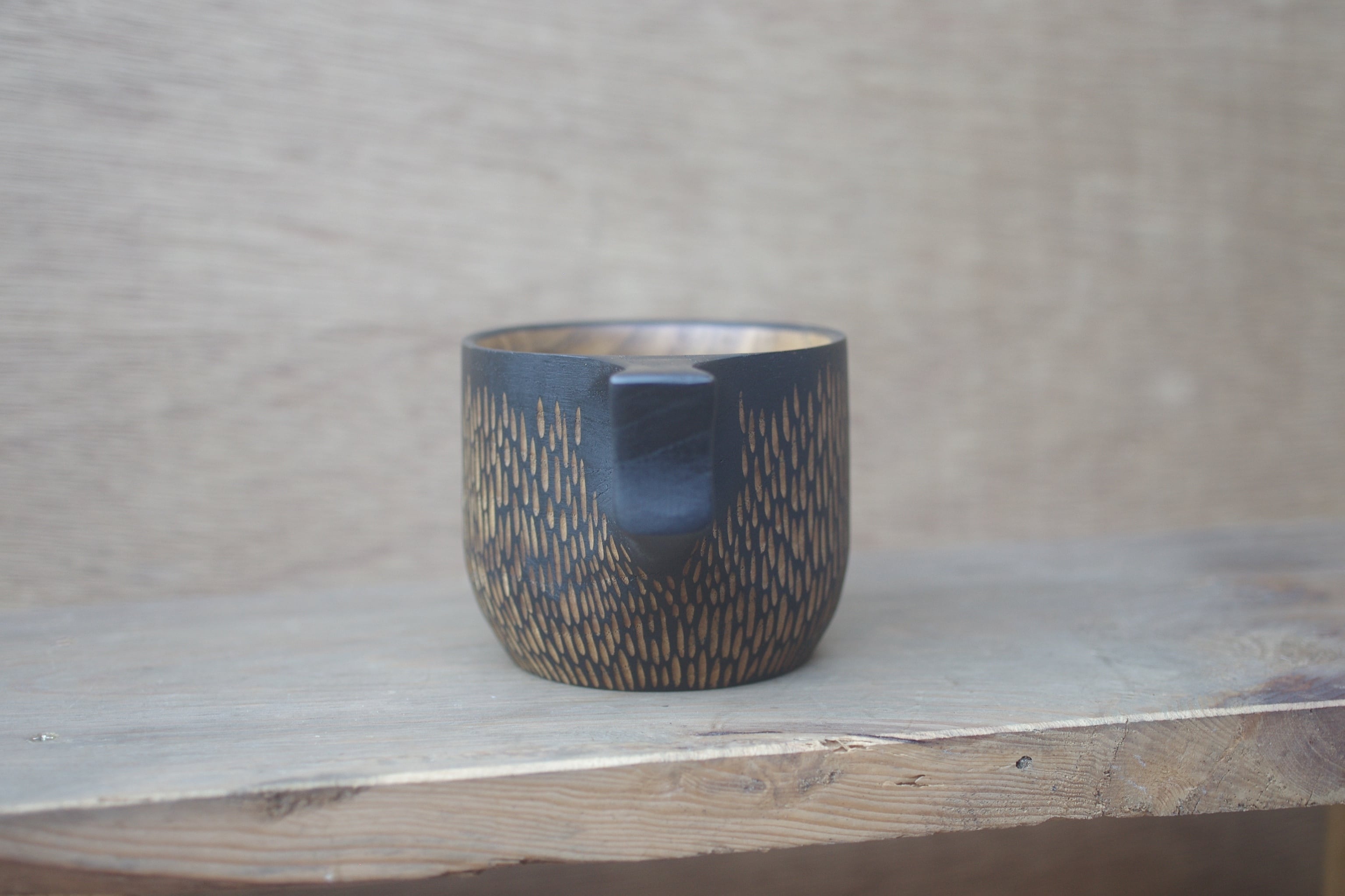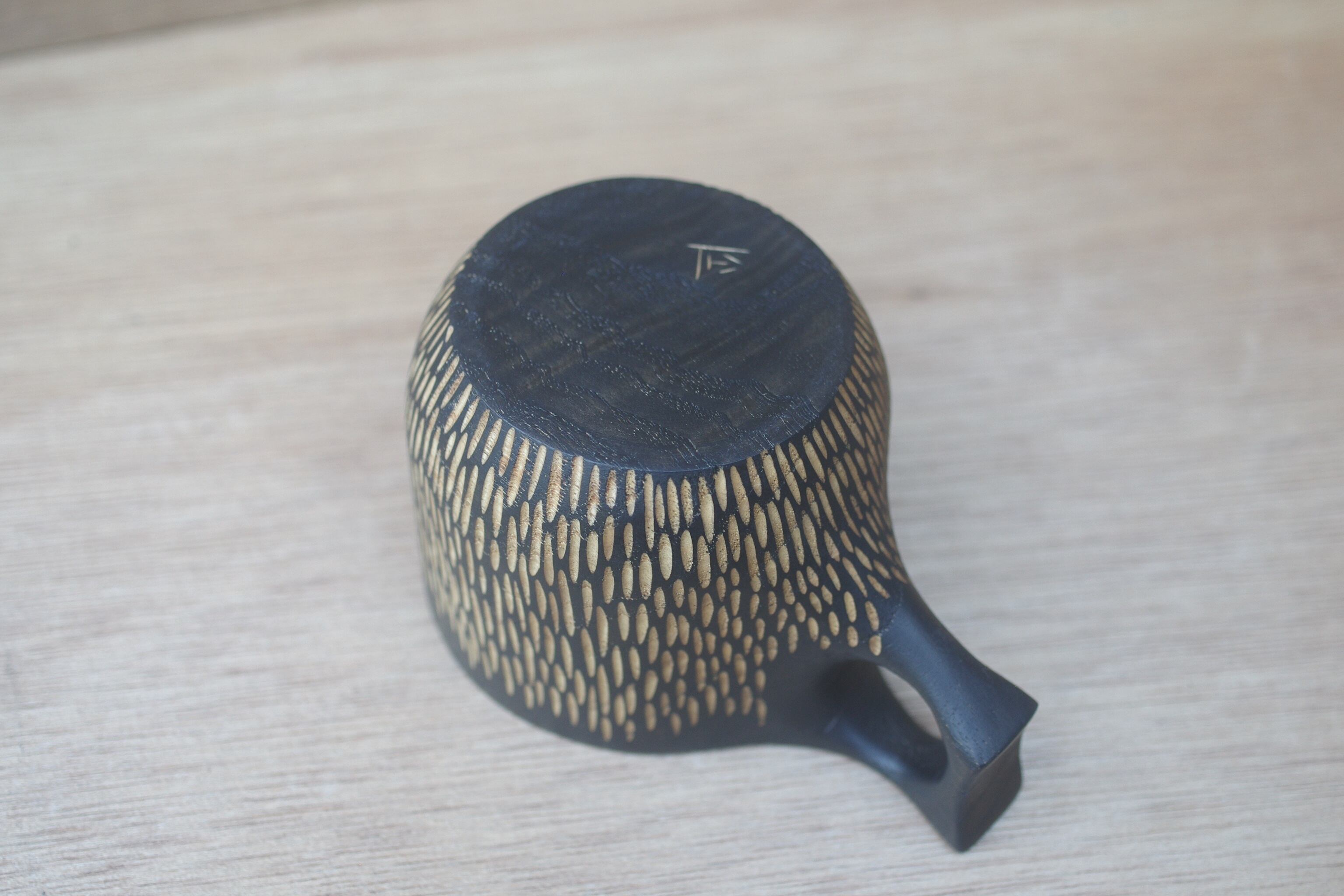 ・鉄媒染で外側を黒く染めた後、彫りの模様を入れています。
